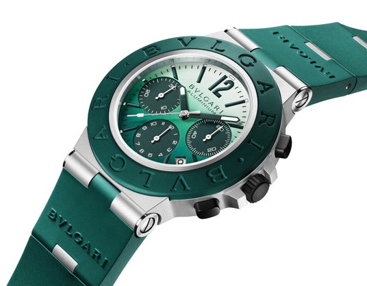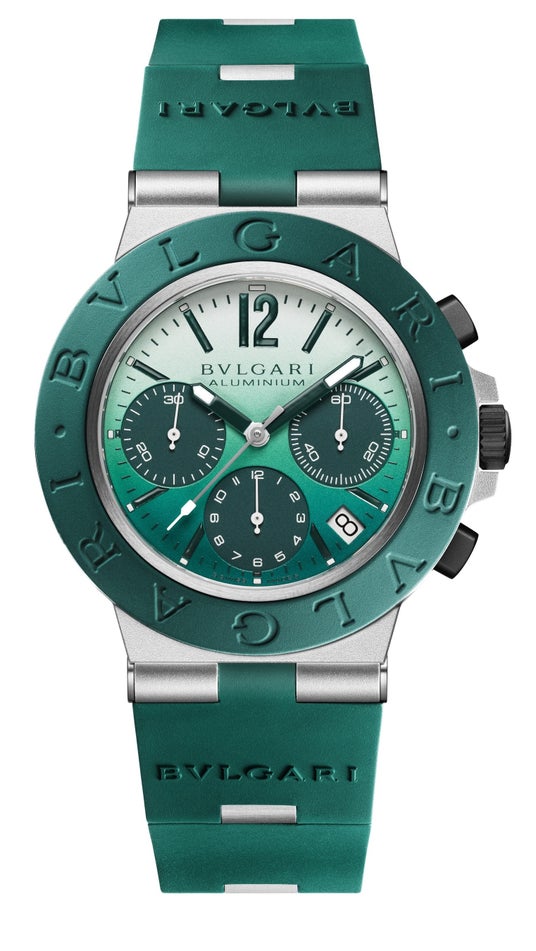 地中海のオデッセイ2023年発表の「ブルガリ アルミニウム カプリ 限定モデル」が想起させるドルチェ・ヴィータのスピリットが2024年にも引き継がれました。「ブルガリ アルミニウム エメラルド 限定モデル」は、イタリアの海辺でのバカンスのストーリーからさらにサルデーニャの海へと誘います。この世界限定1000本のウォッチは、ホワイトからターコイズグリーンへと変化していくダイヤルのカラーリングが特徴的です。ベゼルとストラップにも深みのあるグリーンのラバーを使用し、アルミニウムのリンクで連結されたデザインと相まって遊び心と洗練さを醸し出しています。ダイヤルにはグリーンのクロノグラフカウンター、ダークグリーンの針、4時30分位置には日付表示が配され、エネルギーとエレガンスに満ちた夏の到来を予感させます。