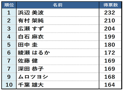 男性部門はアスリートからお笑い芸人、俳優と幅広い結果に。女性部門はミステリアスで大人な魅力のある俳優・タレントがランクイン。