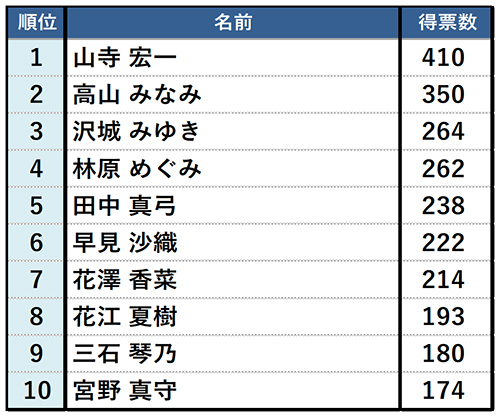 理由:【山寺宏一】声優界のレジェンドだから(30歳女性/大阪府)、七色ボイスが聞きたい(33歳男性/奈良県) 【高山 みなみ】新一の声で「飲み過ぎだバーロー」と言ってほしい(29歳女性/宮崎県) 【沢城 みゆき】大人の女性感をこれでもか!と披露してほしい(27歳男性/福岡県) 【早見 沙織】「大丈夫ですかー?」って言ってほしい(35歳女性/群馬県) 【花江 夏樹】「水の呼吸」を生で聞きたい(35歳男性/神奈川県) 【三石 琴乃】ビールを飲みながら「サービスサービスぅ!」と言って欲しい(26歳男性/岩手県)