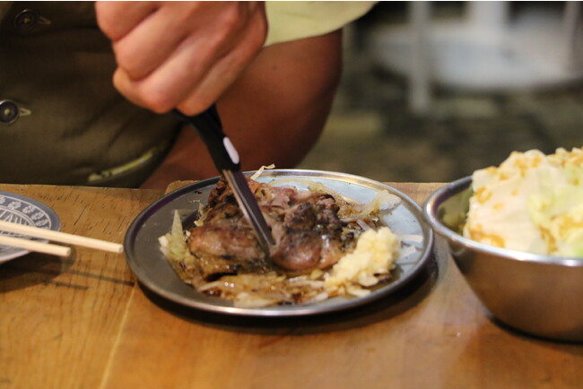 卵を産まなくなった雌鶏「ひね鶏」を炙り、ポン酢で和えた料理です。その強い歯ごたえと旨みに2人は感激します。
