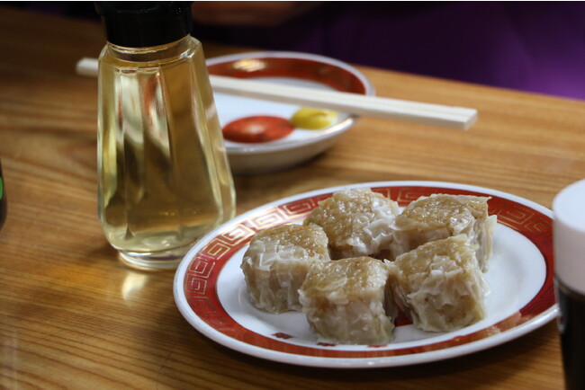 その後、昭和21年創業の中華食堂へ。姫路のソウルフードとして愛されるしゅうまいを頂き、モチモチの皮と野菜が詰まった餡を堪能します。