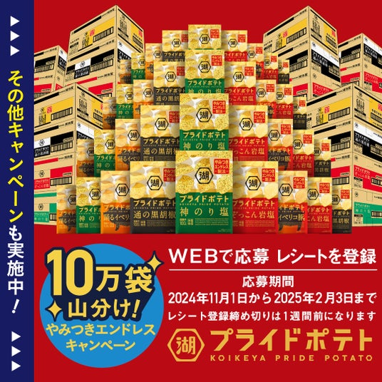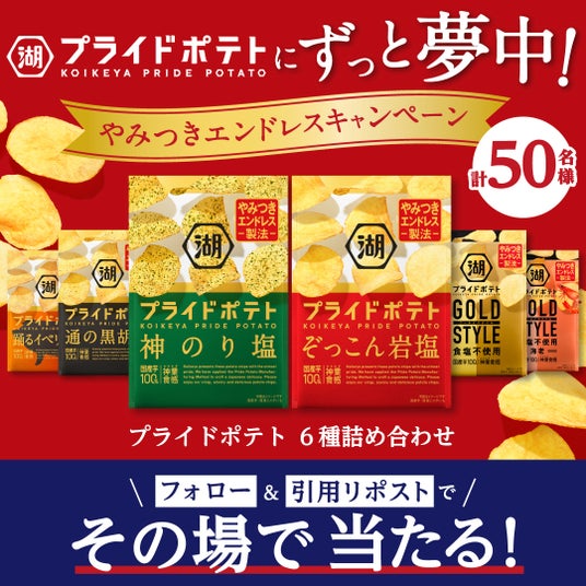 株式会社湖池屋(社長:佐藤章)は、独自の“やみつきエンドレス製法”が引き立てる国産芋の旨みと神業食感で人気の「湖池屋プライドポテト」ブランドにて、2024年12月6日(金)から12月19日(木)まで、「湖池屋プライドポテト」6品がセットで当たるSNSキャンペーンを実施します。