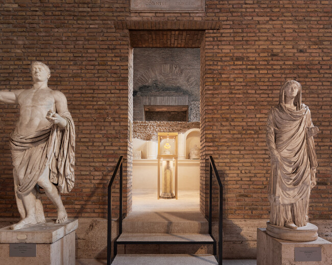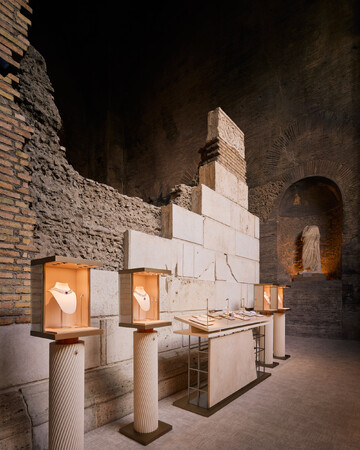 新作「エテルナ」の主要作品の数々は、イタリアの建築家リナ・ボ・バルディにインスパイアされたディスプレイと、歴史あるヴェネツィアの織物メーカー、ルベッリによる高密度のジャカード技法で実現した、画家であり建築家のジョヴァンニ・バッティスタ・ピラネージの版画を見事に再解釈した貴重な特注タペストリーと共に披露されました。この版画は、テルメ・ディ・ディオクレツィアーノのアンティーク見取り図と、ピラネージが1756年に出版した『Antichita Romane』に収めた、セプティミウス・セウェルス時代(紀元203年から211年)の大理石の板に刻まれたローマの古地図「Forma Urbis Severiana」の複製で、ローマの歴史的遺産とイタリアの芸術、職人技、技術を称える傑作であり、ブルガリ、Istituto Centrale per la Grafica、そしてルベッリのコラボレーションによって実現しました。
