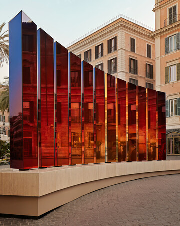 この機会に、オランダ人デザイナー、サビーネ・マルセリスが制作した没入型インスタレーション「Vista Aetern」が、ブルガリ財団の後援のもと、ローマ市に寄贈されました。ローマの都市景観を現代的に解釈したこの作品は5月19日から6月15日まで、ローマのシンボルであるスペイン広場に展示されています。反射するカラーミラーで飾られた12本のトラバーチンの柱で構成され、夜明けから夕暮れまでの太陽の軌跡をなぞるように、一日中絶えず回転し、動くたびに太陽光をとらえて屈折させ、暖かみのある太陽の色調のスペクトルを周囲に投影します。刻々と変化する景色を提供するーそれは、永遠の都の輝きとその建築遺産を讃えるものです。