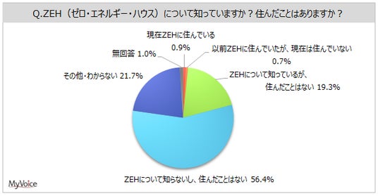 ZEH(ゼロ・エネルギー・ハウス)とは、家庭で使用するエネルギーを高断熱構造や省エネ設備で減らし、太陽光発電などでエネルギーを創出してエネルギー収支を実質ゼロ以下にする住宅です。その認知や居住経験について聞きました。
