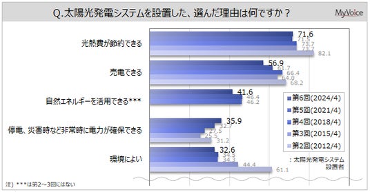 太陽光発電システムの設置理由は(複数回答)、「光熱費が節約できる」がシステム設置者の71.6%、「売電できる」が56.9%、「自然エネルギーを活用できる」が41.6%です。