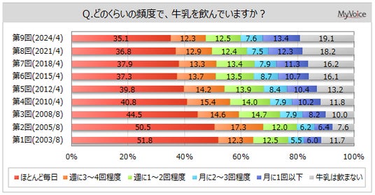 マイボイスコム株式会社(東京都千代田区、代表取締役社長:高井和久)は、9回目となる『牛乳の飲用』に関するインターネット調査を2024年4月1日~7日に実施しました。