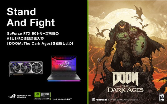 ASUS JAPAN株式会社は、GeForce RTX 50 シリーズ搭載のASUS/ROG製品購入で「DOOM: The Dark Ages」のゲームコードが必ずもらえるキャンペーンを発表しました。