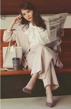 加藤さんが「もしも会社員だったら?」で演じたのは、「帰国子女で、外資系金融会社に勤めるバリバリのキャリアウーマン」。トレードマークの“アイドル前髪”は、さらっと横に流した大人っぽいスタイルにチェンジ。薄ピンクのパンツスーツを着て、パニーニを片手に英字新聞で日本経済をチェックする、THE・“バリキャリ”スタイルに大変身!普段は、その喋り方や仕草から自他ともに認める“へにょへにょ”な加藤さんですが、いざ撮影が始まると今まで見たことのないシャープなまなざしに。普段は見られないクールな顔をみせてくれました。