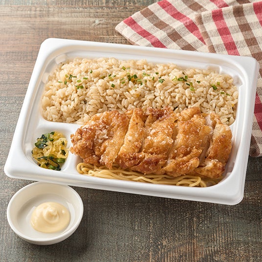 【内容】おろしと刻み2種類のにんにくを使用した、ニンニクと醤油の香りが楽しめる山賊焼と、炒飯を組み合わせたお弁当です。別添のマヨネーズをかけて召し上がることで、味変もお楽しみいただけます。
