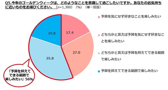 ゴールデンウィークの過ごし方について、意識を尋ねると『予算を抑えてできる範囲で楽しみたい』派が過半数となり、やや控えめな連休となりそうな傾向がみられましたが、そんな中、20~30代では『予算を気にせず好きなことを楽しみたい』派が過半数となり、若者中心に盛り上がりそうな予感も結果からうかがうことができました。