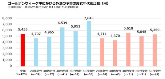 ・ゴールデンウィークの予算は、総額が約35,600円、同じく外食は約5,500円。総額・外食ともに最も高いのは60代男性。
