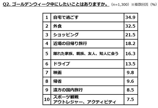 株式会社ぐるなび(本社:東京都千代田区、代表取締役社長:杉原章郎)は、「楽天ぐるなび(https://www.gnavi.co.jp/)」ユーザーなどのぐるなび会員を対象に、世の中のトレンドに合わせて食に関する様々な調査を実施し、「ぐるなびリサーチ部」として定期的に情報を発信しています。今回は、“ゴールデンウィークの過ごし方”について調査しました。詳細は以下の通りです。