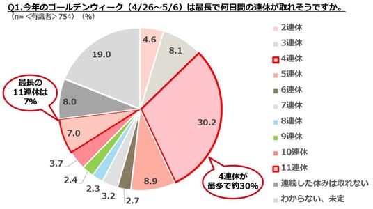 ・今年のゴールデンウィークの連休日数は、カレンダー通りの「4連休」が約30%で最多で、最長の「11連休」は7%。