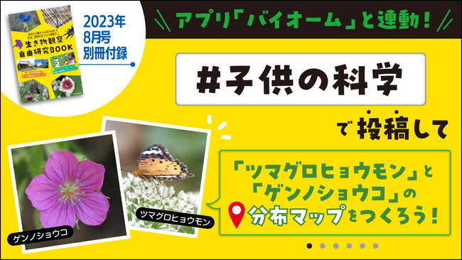 今回、この「バイオーム」と『子供の科学』がコラボして、「ツマグロヒョウモン」と「ゲンノショウコ」を全国調査! 「バイオーム」に投稿するときに、「観察メモ」に「#(ハッシュタグ)子供の科学」と入力して投稿すると、集まったデータが集計され、全国の分布マップとしてまとめられます(調査結果は子供の科学2023年12月号で発表予定)。