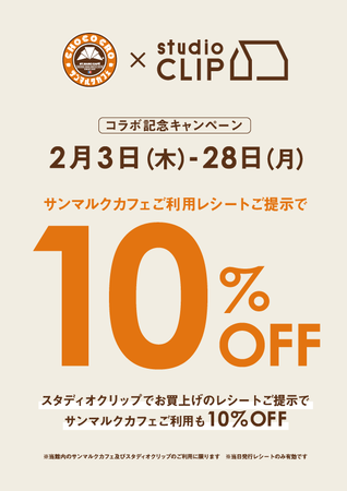 コラボを記念して、studio CLIPと同じ館内にあるサンマルクカフェご利用のレシートご提示で、studio CLIPでのお買い物が10%OFFになるキャンペーンを開催します。
