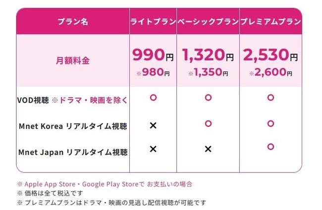 VODコンテンツやMnet Koreaのリアルタイム視聴に加え、CS放送Mnet Japanのリアルタイム視聴、ドラマ・映画の見逃し配信が視聴可能なプラン。