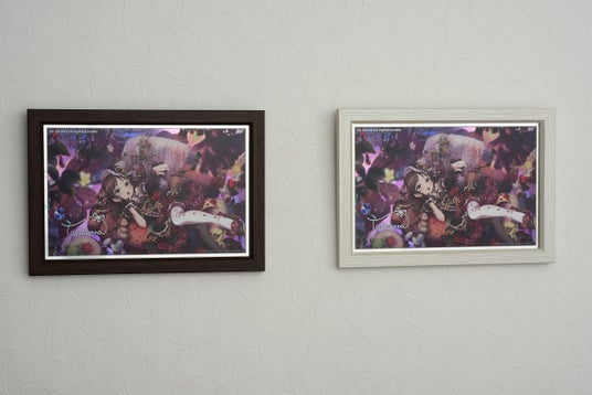 ずっしりとした木枠に収められた美しく輝くガラス製のミラー。ガラス製ミラーの特性に合わせた処理が可能にした、ポートレート写真のような奥行きのある立体的な表現。子供らしさとオトナっぽさが綾なす小悪魔のような魅力。彼女のかれんな姿を「あなた」へ届けるような一枚が完成しました。