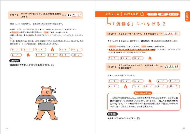 1つのUnitは、練習効果を最大化する「7つのメニュー」で構成。聞き取りから始まり、リピーティングやシャドーイングなどのインプット・インテイクをした後、自分で会話を作り出すアウトプットを行います。練習回数や時間の目安付きでサクサク進められます。全10Unit。