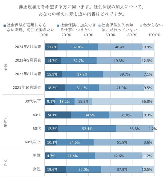 非正規雇用希望者全体では、「社会保険加入有無にはこだわっていない」が最も多く40.4%、次いで「社会保険に加入できる仕事につきたい」が37.0%、「社会保険が適用にならない職場、範囲で働きたい」が11.8%となった。同様の調査は2021年から毎年行っているが、年々「社会保険が適用にならない職場、範囲で働きたい」という割合は減ってきている。