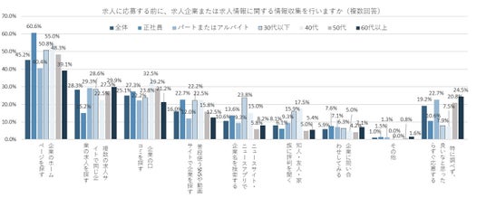 年代別にみると、「30代以下」では「ニュースサイト・ニュースアプリで企業名を検索する」が23.8%で、最新の情報を確認する人が他の年代より多い。「60代以上」では「特に調べず、いいなと思ったらすぐ応募する」が24.5%で、応募まで早い人が多かった。
