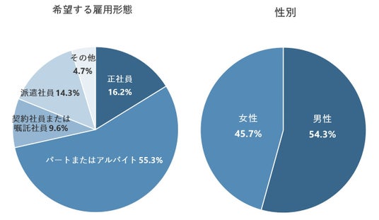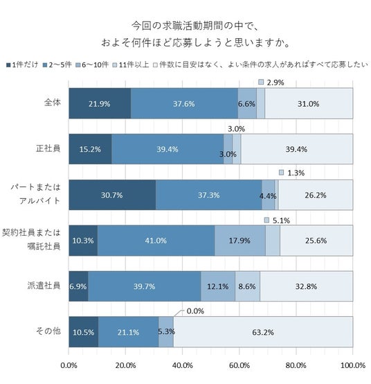 希望雇用形態別にみると、「正社員」では、「件数に目安はなく、よい条件の求人があればすべて応募したい」の割合は39.4%で、4割は目安を設けていないことがわかった。「パートまたはアルバイト」では「2~5件」応募するとした割合が37.3%、「1件だけ」が30.7%で、応募件数に目安を設けて活動している人が多いようだ。