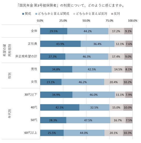 社会保険の加入希望は、「社会保険が適用にならない職場、範囲で働きたい」人の割合が年々減少していることがわかります。一方、国民年金第3号被保険者の制度について説明文を読んだもらったのち、どのように感じるかきくと「賛成」「どちらかと言えば賛成」の合計は7割を超えました。その中でも、女性は男性よりも「どちらかと言えば反対」「反対」の意見が多く、不満を感じる人が多いようです。