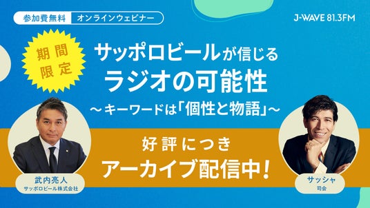 ラジオ局J-WAVE(81.3FM) は、サッポロビール株式会社 常務執行役員マーケティング本部長 武内亮人様をお招きし、無料ウェビナーを2024年2月21日(水)に開催いたしました。ご好評につき、2月28日(水)~3月29日(金)の1か月限定でアーカイブ配信いたします。