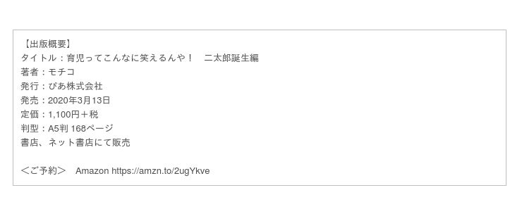 ぴあ株式会社より、モチコ著、コミックエッセイ第2弾『育児ってこんなに笑えるんや! 二太郎誕生編』を、3月13日に発売することが決定いたしました。