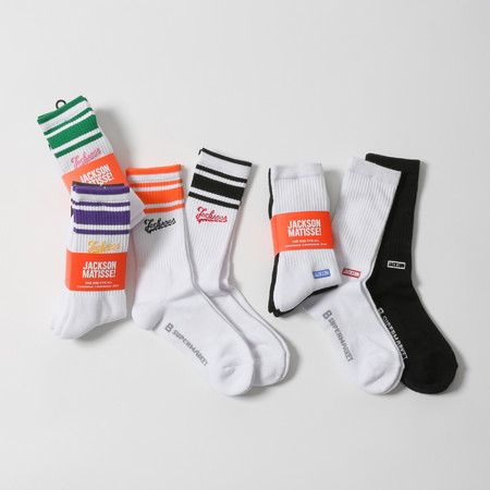 BAYFLOWとJACKSON MATISSE!のコラボライン『B SUPERMARKET』は、2021年の春夏に始動。JACKSON MATISSE!の持つカルチャー「米国・古着・Surf・Skateboard」や、肩の力が程良く抜けた遊び心にBAYFLOWが共感し、コラボレーションが実現しました。アメリカ郊外の小さなスーパーマーケットをイメージし、スポーティーでポップな世界観を表現したプロダクトは男女問わずご好評をいただいております。