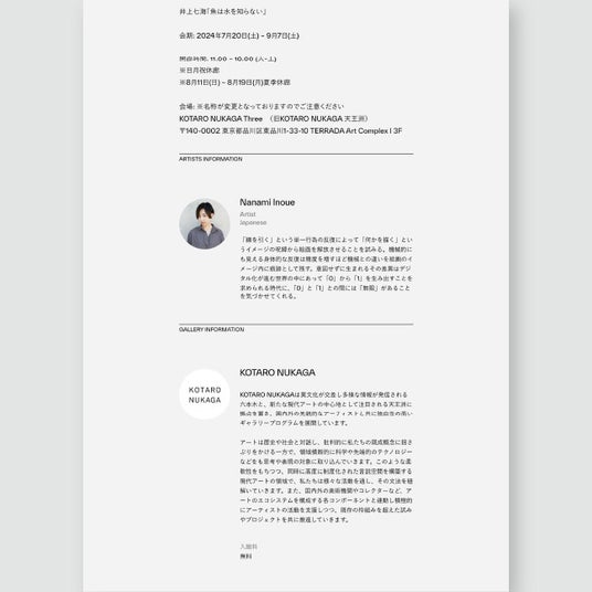 また、ギャラリー・アーティスト・ミュージアム・そのほかアートスペースからのアート情報のお受け取りをご希望される、メディア・フリーライター/エディターの皆様につきましても、新たにご案内を開始いたします。ご希望の方は、以下のフォームよりお問い合わせください。