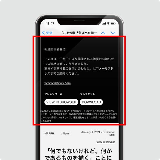 「MARPH」から配信されるプレスリリースのうち、メディア向けに配信されるメールのみにメディア限定メッセージを掲載できるようになりました。プレビューやメディア取材会への招待、記事掲載の際の注意事項、広報担当者の連絡先などの記載などが可能になります。また、展覧会のポイントをまとめたメッセージなどを記載いただくことも可能です。
