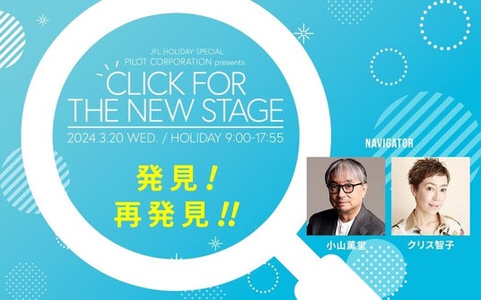 札幌FM NORTH WAVE、東京J-WAVE、名古屋ZIP-FM、大阪FM802、福岡CROSS FM、全国5地区のFMラジオ局で構成するJFL(Japan FM League)では、3月20日(水・祝)9:00~17:55、小山薫堂とクリス智子のナビゲートで、全国のFM局をつなぎ数々の「発見・再発見」をテーマに送る9時間のスペシャルプログラム『JFL HOLIDAY SPECIAL PILOT CORPORATION presents CLICK FOR THE NEW STAGE』をオンエアいたします。