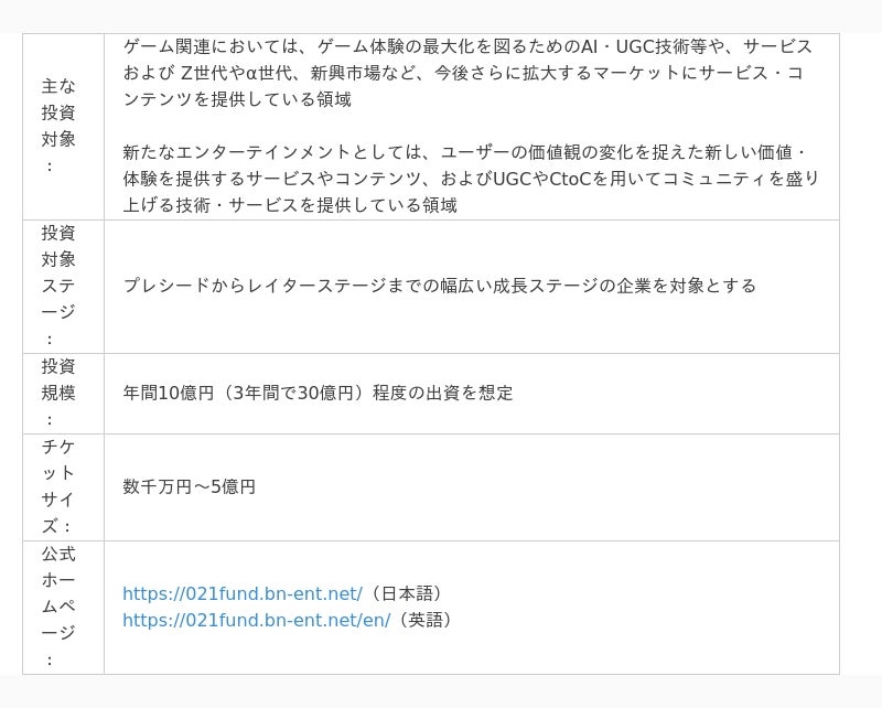 当社は、バンダイナムコグループパーパス「Fun for All into the Future」のもと、中期計画(2022年4月~2025年3月)では、中期ビジョン「Connect with Fans」を掲げ、IPを軸に世界中のIPファン、あらゆるパートナー、グループ社員、そして社会と常に向き合い、深く、広く、複雑につながる存在を目指しています。その上で、Bandai Namco Entertainment 021 Fundは、既存のエンターテインメント事業の強化、そして次世代のエンターテインメント事業の創出に向けた投資を行っています。