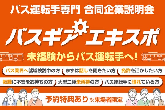 バスギアエキスポは、バス運転手への就職を目指す求職者と、慢性的な運転手不足に悩むバス会社を繋ぐため実施するマッチングイベントです。
