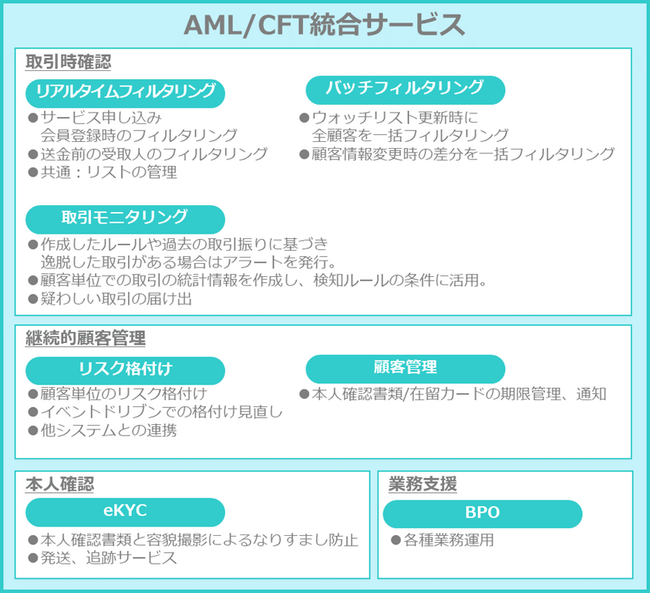 そこでTISは、AML/CFT対策に関する機能を具備し、犯罪収益移転防止法やマネー・ローンダリングガイドラインへの対応を支援する本サービスの提供を開始します。
