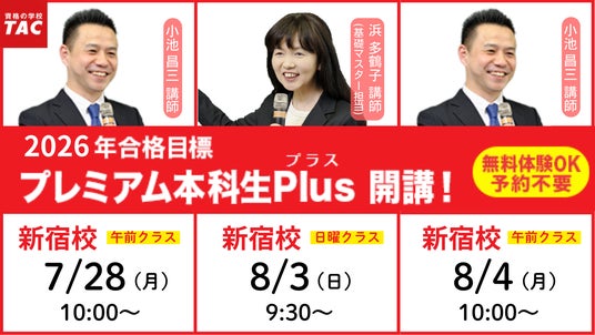 行政書士試験対策講座を展開しているTAC株式会社(東京都千代田区、代表取締役:多田敏男)は、2026年合格目標 初学者コース『プレミアム本科生Plus』を7/28(月)より順次開講。また、開講日はどなたでも実際の講義を体験できる「無料体験入学」を実施します。