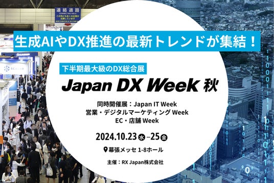 RX Japan株式会社(本社:東京都中央区、代表取締役社長:田中 岳志)は2024年10月23日(水)~25日(金)の3日間、「Japan DX Week 秋」を「Japan IT Week 秋」「営業・デジタルマーケティング Week 秋」「EC・店舗 Week 秋」とあわせて幕張メッセにて開催いたします。今回は(独)中小企業基盤整備機構(中小機構)に特別協力いただき、展示会場内に「DX推進の第一歩! IT・デジタル化相談コーナー」を特設。その場でITの専門家に課題を無料相談できます。皆さまのご来場・ご取材をお待ちしております。