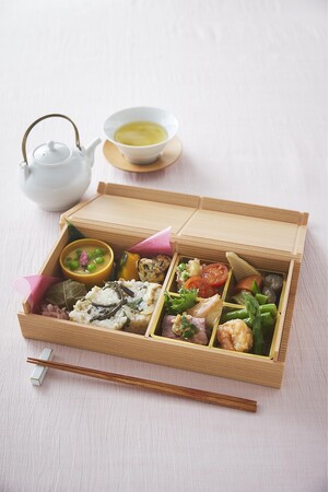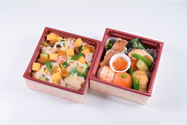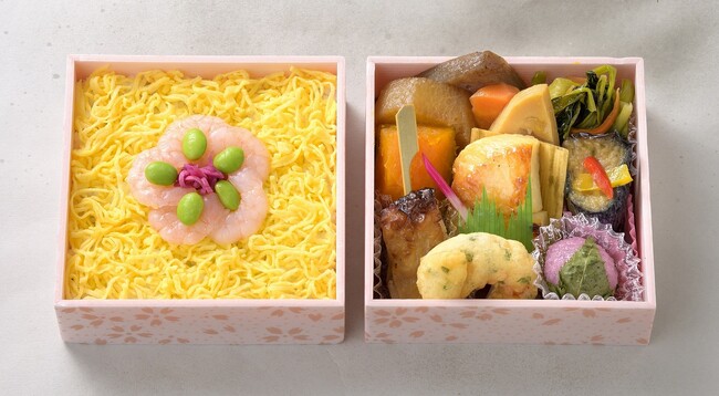 お花畑をイメージしたちらし寿司と肉、魚、野菜の煮物、桜餅を詰め込んだ母の日限定の二段弁当です。
