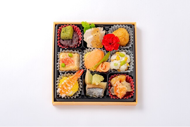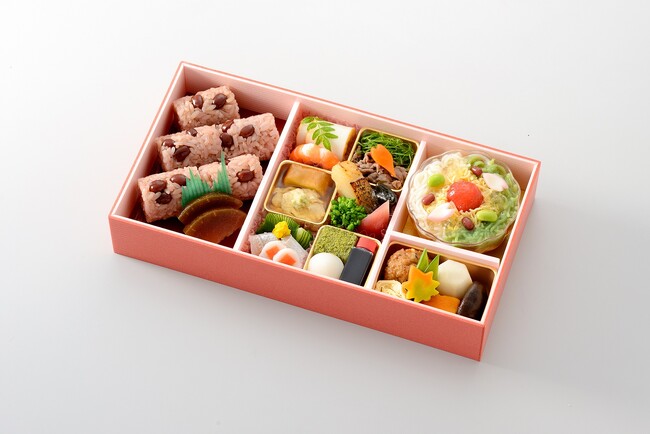 朱色に染めた華やかな折箱に、プチトマトや枝豆、花びらゆり根で鮮やかにトッピングした魚そうめんジュレ掛けなど、母の日のお祝いに贈る限定のお弁当です。