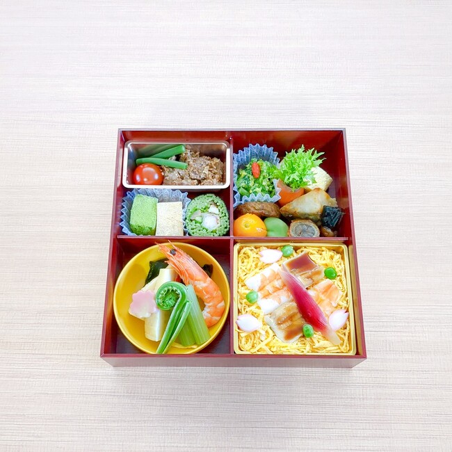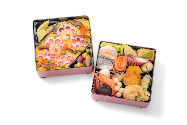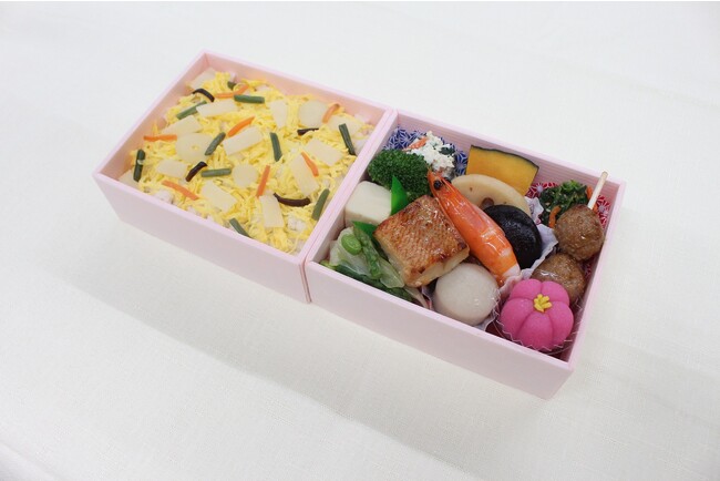 海老と赤魚をメインに、彩り豊かな食材を詰めた“おかず段”と、ちらし寿司を詰めた“ご飯段”の2段弁当です。