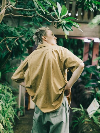 バギーショーツと同様テンセル / リネン素材を使用したオープンカラーシャツ。ゆったりとしたシルエットで、後ろ身頃に深いタックをとることによる綺麗なドレープが生まれます。