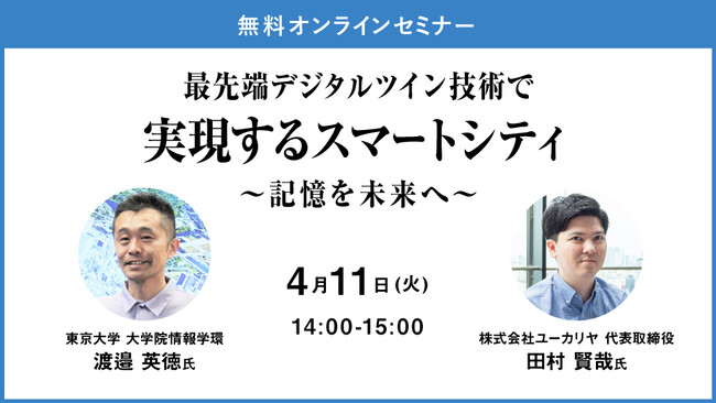 本セミナーでは、東京大学教授 渡邉 英徳氏をお迎えし、渡邉教授がこれまで取り組んできたデジタルツインのアーカイブを紹介するほか、震災や海外情勢、及び世界のスマートシティ事情について解説いただきます。また、株式会社ユーカリヤ 代表取締役の田村賢哉氏が、デジタルツインを使った地域活性化の事例とデジタルツインのノーコード開発を、実演を踏まえて紹介します。