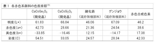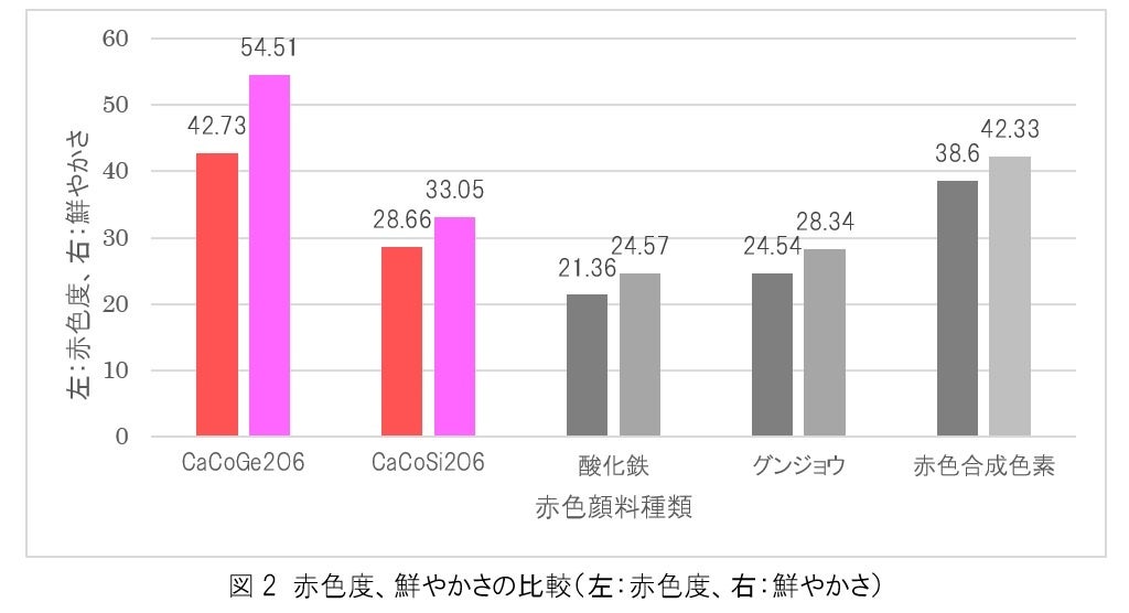 測定および算出した結果、開発した「CaCoGe2O6」と「CaCoSi2O6」は、既存の赤色系無機顔料である酸化鉄、グンジョウを超える鮮やかさと高い赤色度を兼ね備えていることを確認しました(表1、図2、図3)。