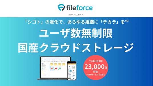 利用社数23,000社突破の国産クラウドストレージ「Fileforce」は、ランサムウェア対策機能を標準実装し、ファイルサーバ・NASのクラウド移行や、社外との安全なファイル共有を、‟ユーザ数無制限”で実現します。また、ファイル利活用の基盤としてだけでなく、ファイル起点の業務を圧倒的に効率化するワークフローやAIフォルダなど、多彩な進化でお客様のDX推進を支えます。