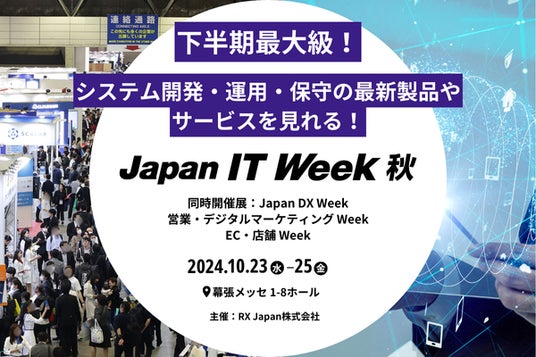 RX Japan株式会社(本社:東京都中央区、代表取締役社長:田中 岳志)は2024年10月23日(水)~25日(金)の3日間、「Japan IT Week 秋」を「Japan DX Week 秋」「営業・デジタルマーケティング Week 秋」「EC・店舗 Week 秋」とあわせて幕張メッセにて開催いたします。今回から、急成長するデータセンター市場に対応し、後援に「特定非営利活動法人 日本データセンター協会(JDCC)」「北海道ニュートピアデータセンター研究会」を迎え「データセンター EXPO」を新規開催。最新のITトレンドを網羅できる場となります。皆さまのご来場・ご取材をお待ちしております。