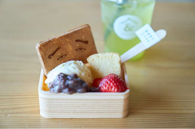 「&LOCALS」の手作りお菓子“たわわ”と、明治39年(1906年)創業の「東雲堂」のユーモアあふれる煎餅“二○加煎餅(にわかせんぺい)”がコラボした阪神梅田本店限定のスイーツ。九州産のいちごや濃厚なアイスクリームもたまらないパフェをお弁当仕立てにしました。ホッとひと息つけるお茶もご用意。