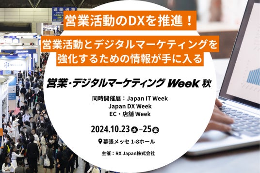 RX Japan株式会社(本社:東京都中央区、代表取締役社長:田中 岳志)は2024年10月23日(水)~25日(金)の3日間、「営業・デジタルマーケティング Week 秋」を「Japan IT Week 秋」「Japan DX Week 秋」「EC・店舗 Week 秋」とあわせて幕張メッセにて開催いたします。皆さまのご来場・ご取材をお待ちしております。