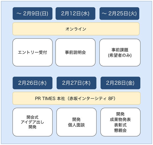 今回のハッカソンは2月26日(水)~2月28日(金)の3日間、PR TIMESの本社にてオフライン開催します(※)。以下、当日のスケジュールをご説明いたします。
