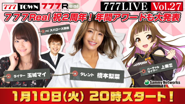 株式会社サミーネットワークスは、ぱちんこ・パチスロがパソコン、スマホで打てる「777TOWN(スリーセブンタウン)」、無料で遊んで豪華景品がもらえるスマホ向けサービス「777Real(スリーセブンリアル)」の生放送を、2023年1月10日(火)20時から配信いたします。